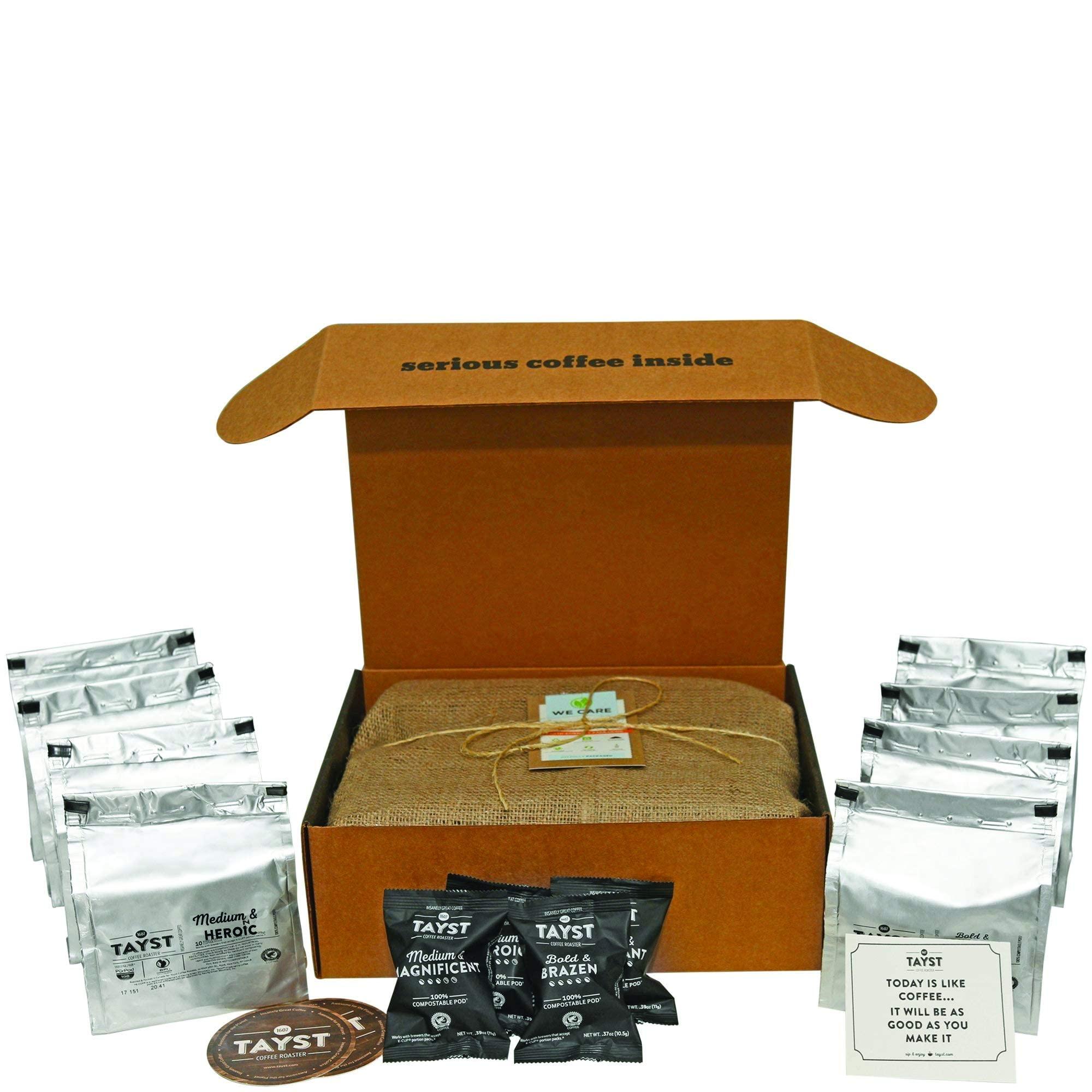 - Coffee with a purpose. Our coffee is sourced sustainably to be in harmony with the planet. We're focused on transitioning homes & offices from traditional plastic kcups into Tayst's 100% compostable pods. Simple changes have great impact.