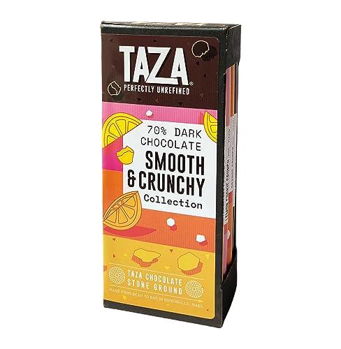 "Four of our most popular chocolate bars in a colorful library-style gift box Our Smooth & Crunchy Bars are silky smooth 70% dark chocolate studded with LOTS of crunchy mix-ins to create an irresistibly delicious healthy treat Each Bar Bundle contains one bar each of Orange Crunch, Chocolate Cookie Crunch, Lemon Cookie Crunch, and Cornflake Crunch; Taza Chocolate is always organic, non-GMO, vegan, dairy free, gluten free, soy free and kosher; Our pioneering Direct Trade cocoa sourcing program pays more money to farmers than Fair Trade; And since were a bean-to-bar chocolate maker, we control every step of the process to create the highest quality chocolate This is a gift you can feel good about giving to all the chocolate lovers in your life; If youre a longtime Taza lover, Smooth & Crunchy bars deliver all the flavor and quality of Tazas unique perfectly unrefined, highly textured chocolate (like our Chocolate Discs and Amaze Bars), but with a new silky smooth texture and lots of fun mix-ins "