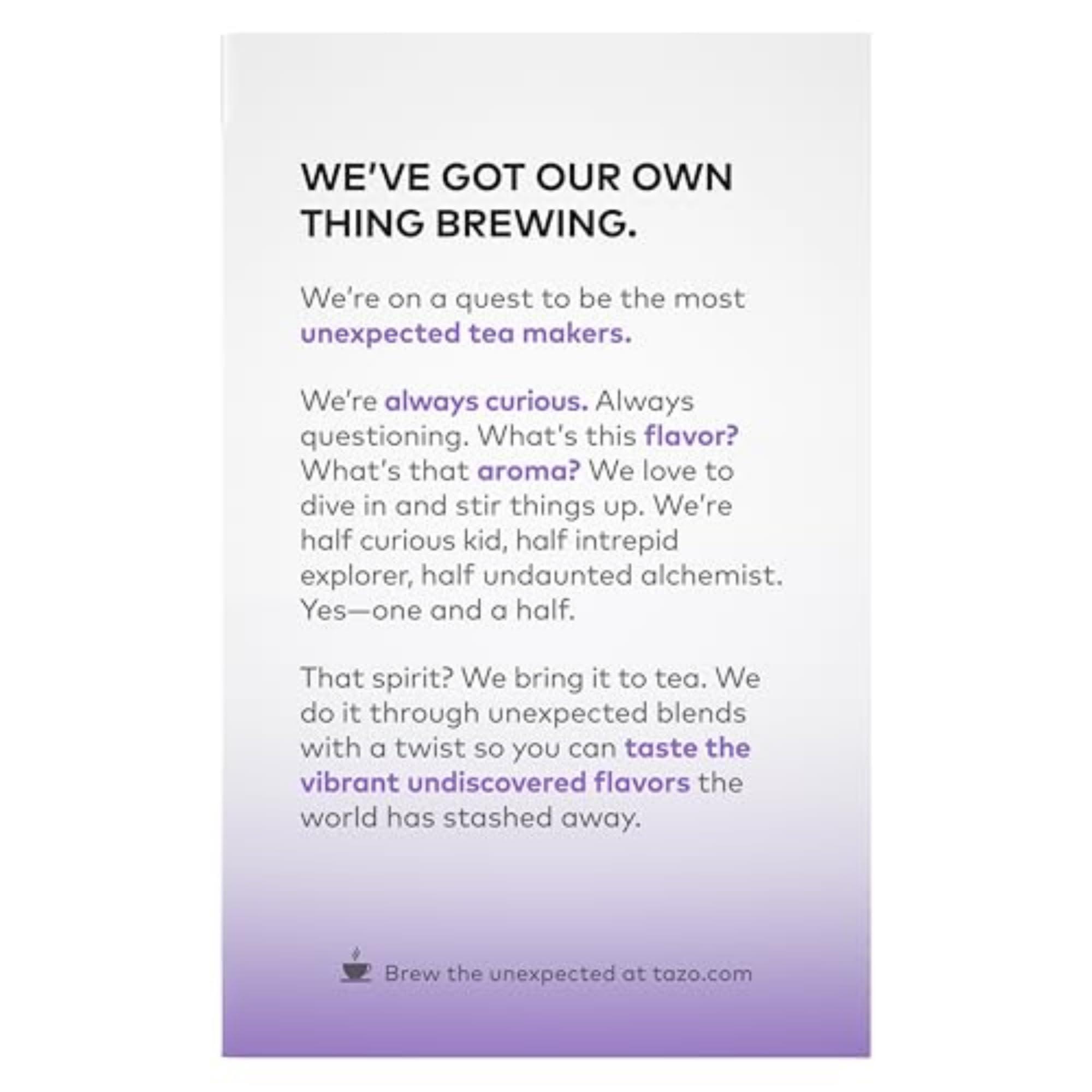 TAZO Glazed Lemon Loaf Herbal Tea feeds your cravings of lemon loaf with tangy notes of lemon and velvety creamy vanilla. Why spend 50 minutes cooking lemon loaf when you can brew this flavored tea in your favorite cup. This indulgent tea blend is carefully presented in 15 individually wrapped black tea bags to preserve the flavor you love. Add a bag of Glazed Lemon Loaf tea to your cup, top it up with hot water and let it brew for 5 min to release the aroma. At TAZO, were on a quest to be the worlds most unexpected tea makers. We explore unexpected blends. We tell unexpected stories to go with them. Witty, entertaining, unconventional stories of TAZO drinkers: People seeking to brew the unexpected in every aspect of their lives. Were always curious, always seeking, always questioning. Whats this, Whats that, We love to get right in there and mix it up. Were half curious kid, half intrepid explorer, half undaunted alchemist. Yes one and a half. Its the unpredictable, the unforeseen that drives us.