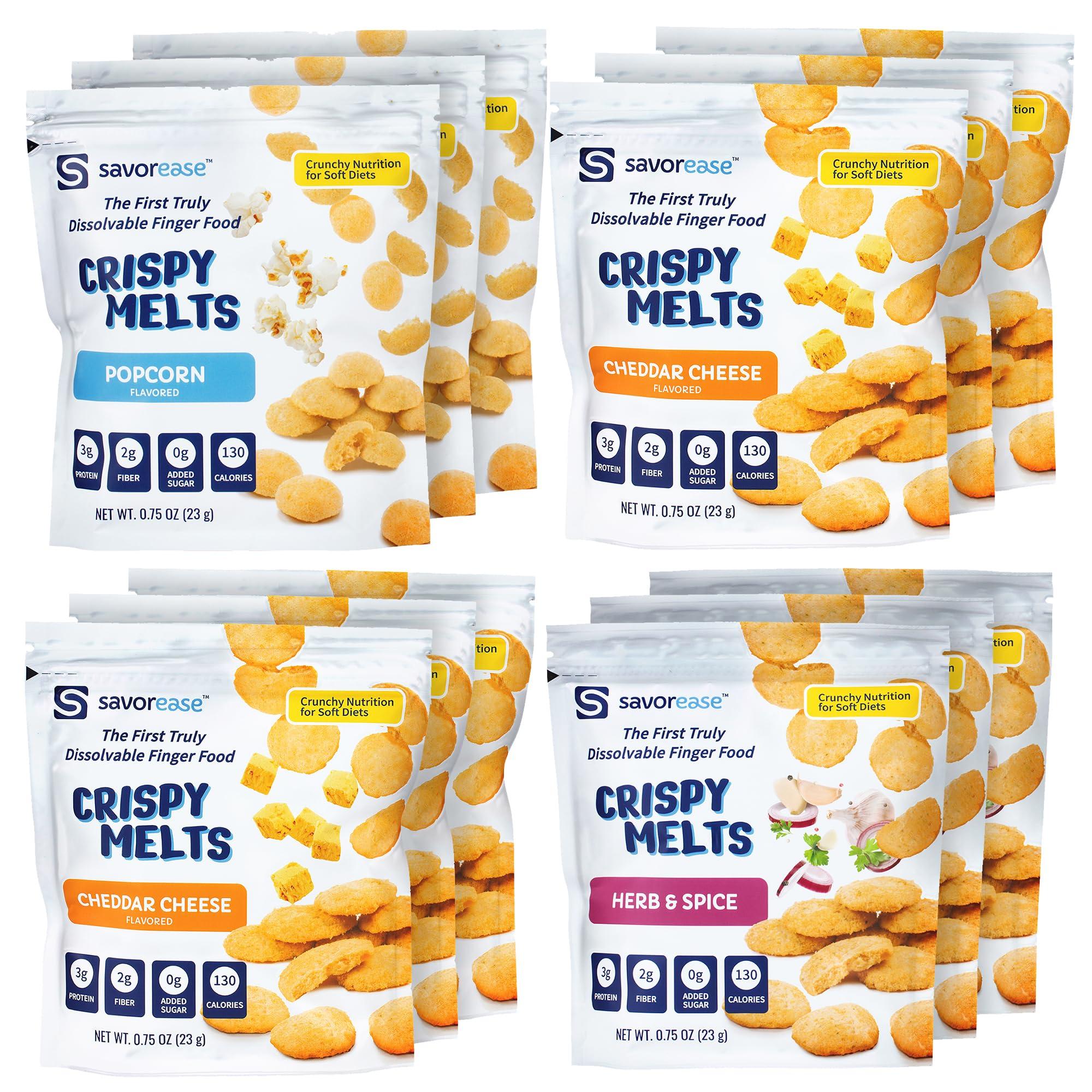 - VARIETY PACK CRISPY MELTS: Crafted for soft diets, by a team of doctors, dietitians, chefs, and swallow specialists, our 12-Pack Varity includes six packs of Vegan Chedder Cheese, three packs of Herb & Spice, and three packs of Popcorn.
