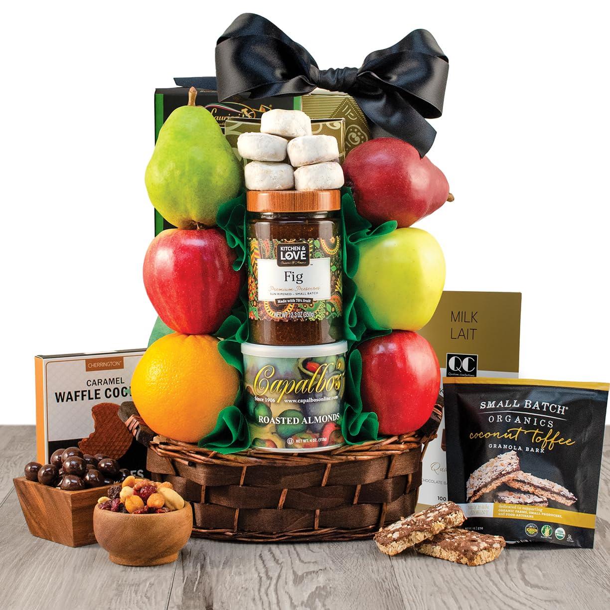 - Seven pieces of farm fresh fruit, Kitchen & Love fig premium preserves, Scrocchi rosemary crackers, Milk chocolate bar,Unna Bakery oat cookies, Kedem vanilla tea biscuits, Cherrington caramel waffle cookies, Ghirardelli milk chocolate caramel minis, Chocolate covered peanuts, Roasted almonds, This basket is Kosher and certified OK-Dairy, Two-handled oval basket