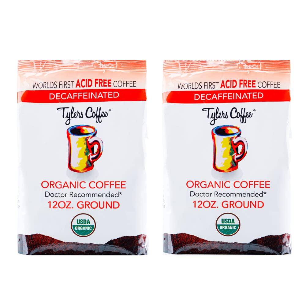 TYLERS COFFEE Tylers Acid Free Organic Ground Coffee - 100% Arabica Full Flavor Decaffeinated - Neutral pH - No Bitter Aftertaste - Gentle on Digestion Reduce Acid Reflux -Protect Teeth - For Acid Free Diets- Natural Whole Bean and Organic Blend for Common GI Issu
