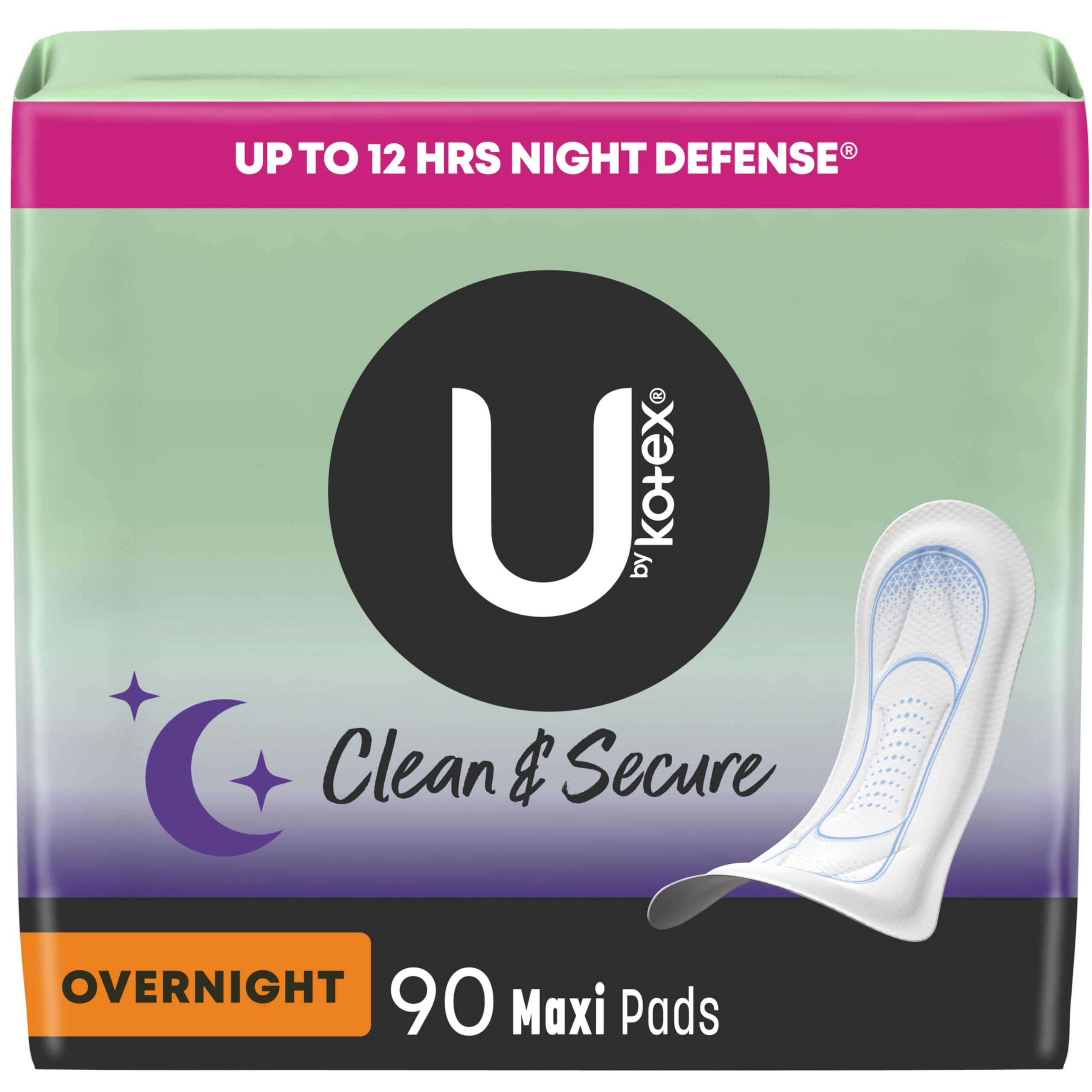 - U by Kotex Clean & Secure Maxi Pads, Overnight Absorbency, 90 Count (3 packs of 30, 90 feminine pads total)