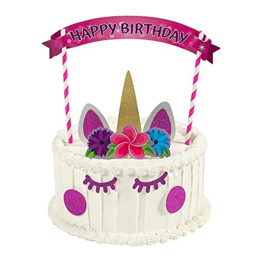 - Make your cake magical with this convenient decorating kit! This kit comes with everything you need to turn a birthday cake into a beautiful unicorn. It features lovely glitter accents as well as a banner pre-printed with Happy Birthday. Find even more unicorn-themed birthday party supplies on this website. Kit includes two 7 3/4" paper straws, ten 1 1/2" - 2 1/2" x 1" - 4 1/4" cardstock accents on wooden sticks and one 9 1/2" x 2 1/2" cardstock banner. Accent pieces are one-sided only. Decora