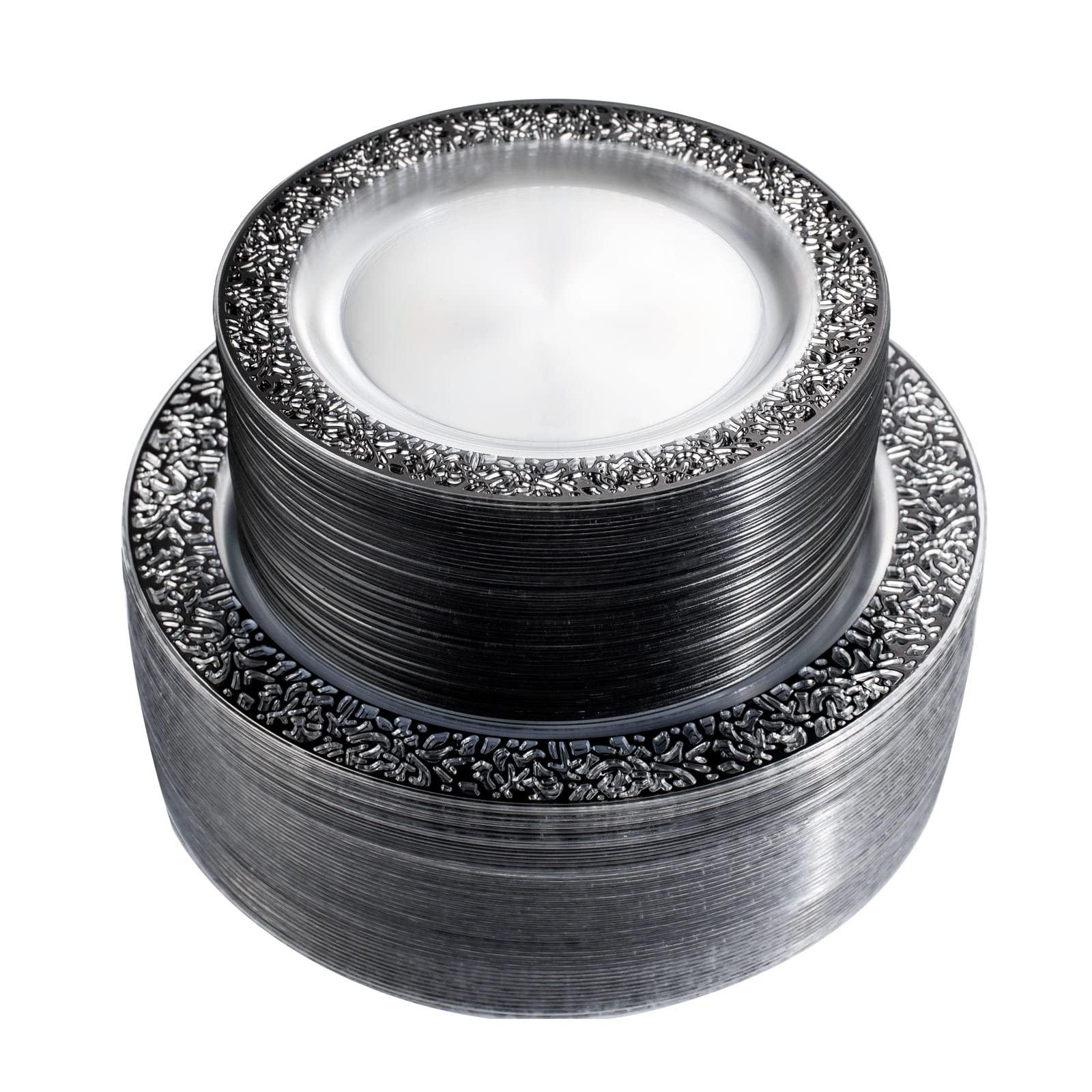 - Exquisite Design: Catch the attention of the whole audience! These heavyweight plastic plates disposable feature a sleek black lace design that matches the silverware perfectly. Add a touch of class and elegance to the party.