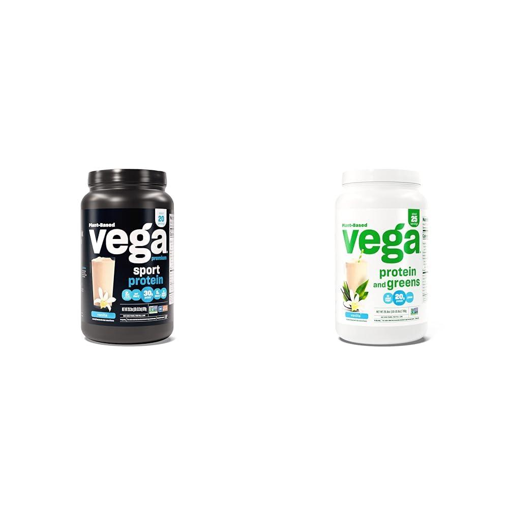 - Product 1: Vega Premium Sport Protein Vanilla Protein Powder: One 29.2 oz tub of Vega Premium Sport Protein Vanilla Protein Powder contains about 20 servings; the vanilla drink mix blends seamlessly into water, milk, or protein smoothie for rich vanilla protein shakes without the clumps or grit