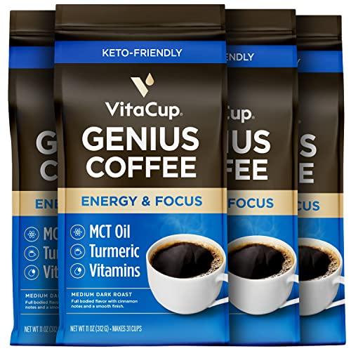 - ENERGY & FOCUS: Genius Coffee is here to elevate your day. Gourmet ground coffee infused with superfoods MCT Oil, Cinnamon, and Turmeric provide healthy fats that support lasting energy and focus.