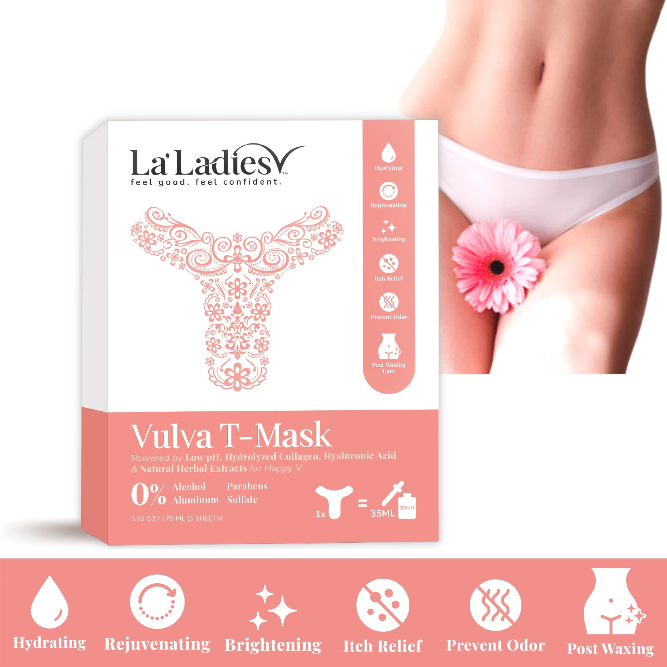 [About La'Ladies V] We believe in womans intimate wellness can improve overall happiness and life quality. We truly understand the conditions of a womans body through changes from puberty, motherhood, perimenopause to menopause, or even daily activities can cause common female issues; symptoms like dryness, itching, irritation, and odors. Sometimes, discussing our vaginal health can end up uncomfortable, embarrassing and costly treatment. Thats why Vulva T-Mask offers the solution that truly stands for quality and affordable thats for the ultimate home spa experience to promote intimate wellness as part of every womans self-care regime. [Vula T-Mask] The premium mask shape is ergonomically designed to provide efficiency, comfort, easy to use, no mess anymore. Hydrogel quality to lock in the moisture and easily absorbed. [Ingredients] Hyaluronic Acid, Collagen & Natural Herbs. Extra gentle with low pH that respects the natural acidity of the vagina. [Key Benefits] Hydrating, Rejuvenating, Brightening, Itch Relief, Prevent Odor, Post Waxing Care, Soothe Vaginal Burning Sensory, Postpartum Care. If youre looking for a little self-pampering home spa, post-waxing care, soothe dryness and itchiness, discomfort caused by sporty, outdoor activities or ageing. [Directions] 1) Wash and dry vulva area 2) Relax and apply the mask on the vulva area and let it sit around 15 20 minutes 3) Remove the mask and gently massage the remaining serum until all nourishing ingredients are fully absorbed. [For Best Initial Result] We recommend masking for 5 consecutive days, regular 2-3 times weekly maintenance as part of the beauty regimen. TRY IT YOURSELF! A Dose of Self Love, you know she's worth it.