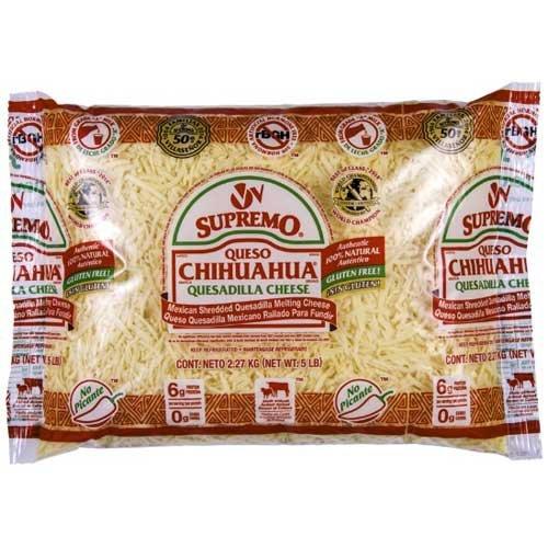 VV Supremo Shredded Queso Chihuahua Cheese, 5 Pound -- 4 per case. Traditional Mexican Melting Cheese Made From All natural, Non processed Ingredients.. The Distinctive Color, Smooth, Rich Texture And Mild, Buttery Flavor Make This The Highest Quality. Quesadilla Cheese In The Marketplace.