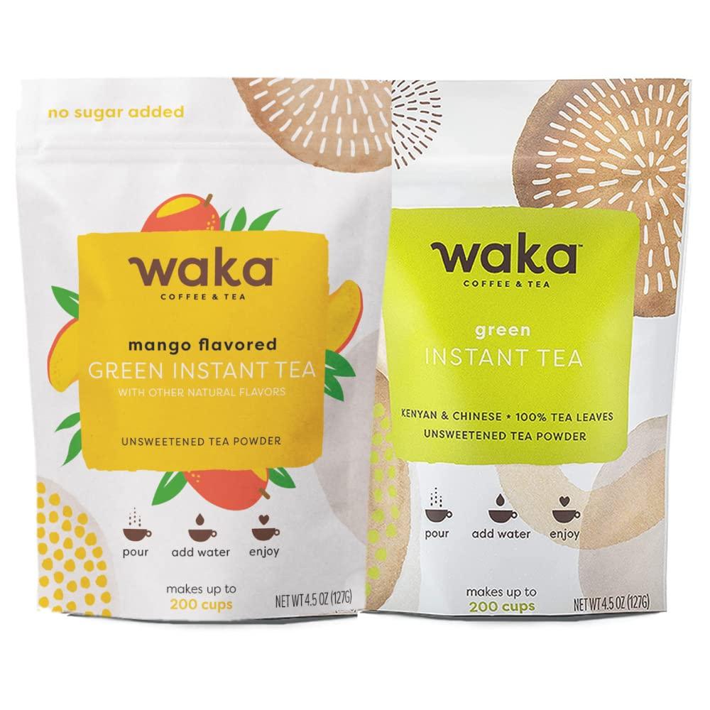 - Delicious Tea Bundle: Our classic green tea offers bittersweet and earthy notes. Our mango-flavored green tea offers bright notes of juicy, tropical mangos. All Waka Green Teas and Black Teas have approx. 35mg of caffeine per serving (2tsp).