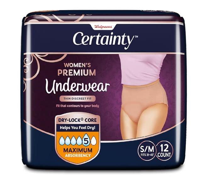 *Item is going through packaging updates and product received may vary from product imaged. Certainty women's premium underwear features a Dry-Lock Core to help you feel dry, a GelBloc Core with odor-absorbing technology, and a comfortable fit that contours to your body & moves with you. Designed for maximum absorbency, Certainty women's premium disposable protective underwear (pull-ons) are thin & discreet, quiet under clothing and fit like real underwear using soft, breathable material. Product Features: Thin discreet fit .Contours to your body & moves with you. Easy to pull on & off. Soft breathable material. Discreet & quiet under clothing. GelBloc Core, Odor Absorbing Technology. Absorbent core absorbs leaks in seconds. Small/Medium. Fits waist 31" - 43". 12 Count. Made in Sweden.Step 1: Just step in and pull on. Step 2: Wear like regular underwear. Step 3: To remove, slip off like regular underwear or tear along each of the perforated, tear-away sides. Step 4: Roll up and dispose of in a sanitary manner. DO NOT FLUSH.Caution: Underwear, like most articles of clothing, may burn if exposed to flame or other sources of ignition. To avoid danger of suffocation, keep this plastic bag away from babies and children. Do not use this bag in cribs, beds, carriages, or playpens. This bag is not a toy.