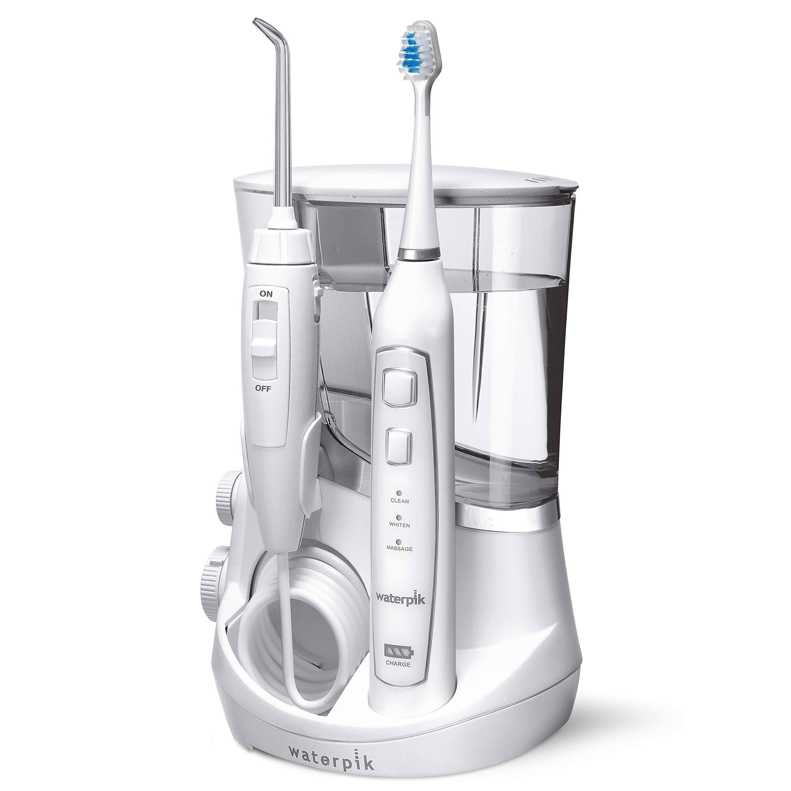 The Waterpik Complete Care 5.0 Water Flosser + Sonic Toothbrush WP-861 combines water flosser and sonic electric toothbrush technologies to create a perfect daily oral care routine. Now you can brush and floss with one convenient device that saves counter space and power outlets. And it's ideal for anyone with braces, implants, crowns, bridges, or other dental work. Complete with 10 pressure settings for low to high power, 5 water flossing tips, 2 brush heads, and the rechargeable Triple Sonic toothbrush, the Complete Care 5.0 is the ideal combination for all of your brushing and flossing needs.