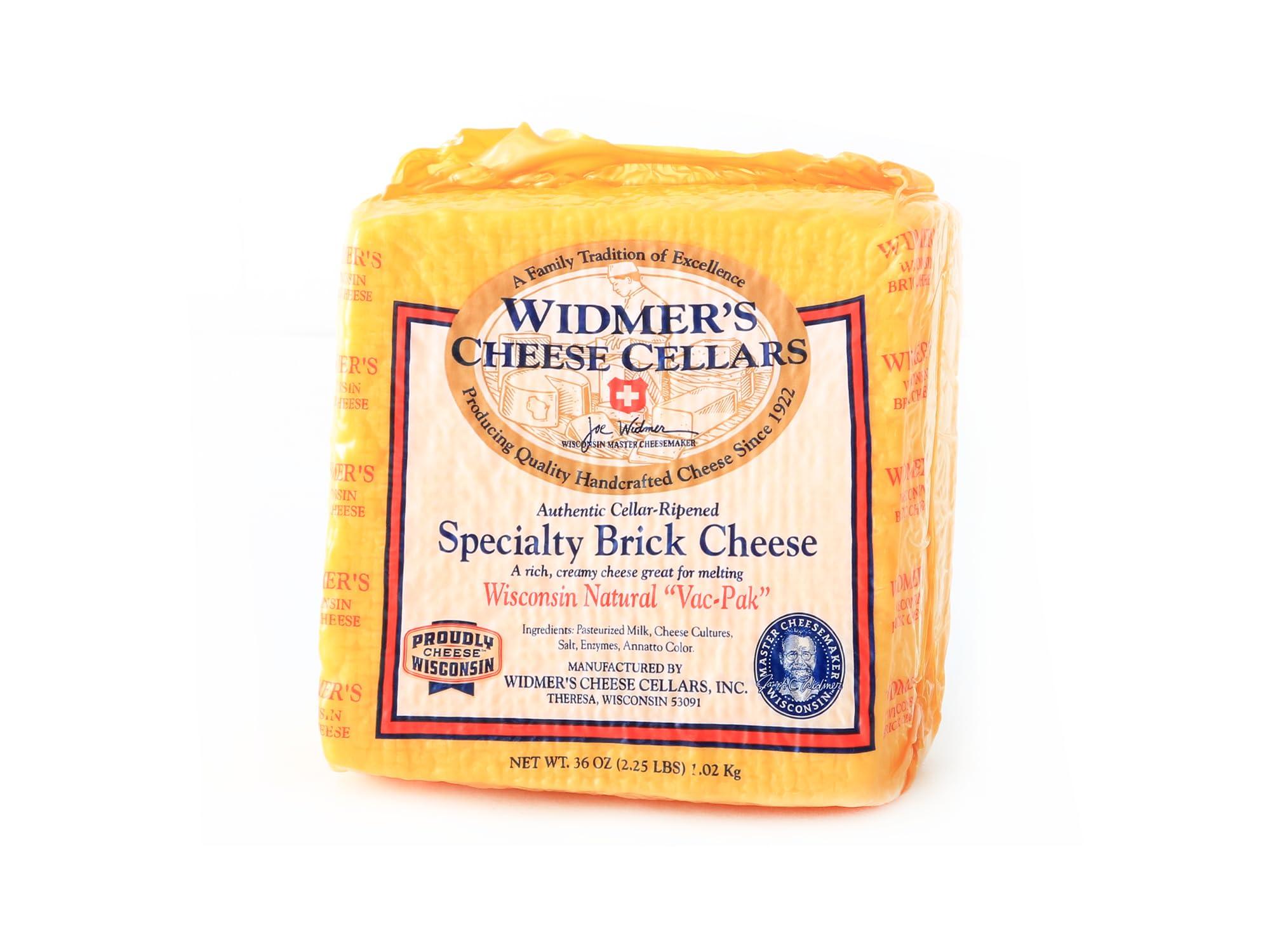Brick cheese is a Wisconsin original cheese. John Jossi, a Swiss-born American cheese maker, invented it in 1877. He taught the recipe for Brick cheese to a dozen other Wisconsin dairies, and it was later sold to Kraft. Although many variations of Brick cheese are made today, only a small percentage of it is authentic, with a distinct, traditional flavor. Brick cheese is commonly used to make Detroit style pizza. Original Wisconsin Brick cheese is smear-ripened to develop a full, earthy flavor with maturity. This Wisconsin Mild Brick cheese is a young version of the authentic, cellar-ripened brick. The flavor is mild and sweet, which makes it an extremely versatile cheese. The texture is rich and creamy, and this Brick cheese melts beautifully. Made by Widmers Cheese Cellars in Theresa, Wisconsin.