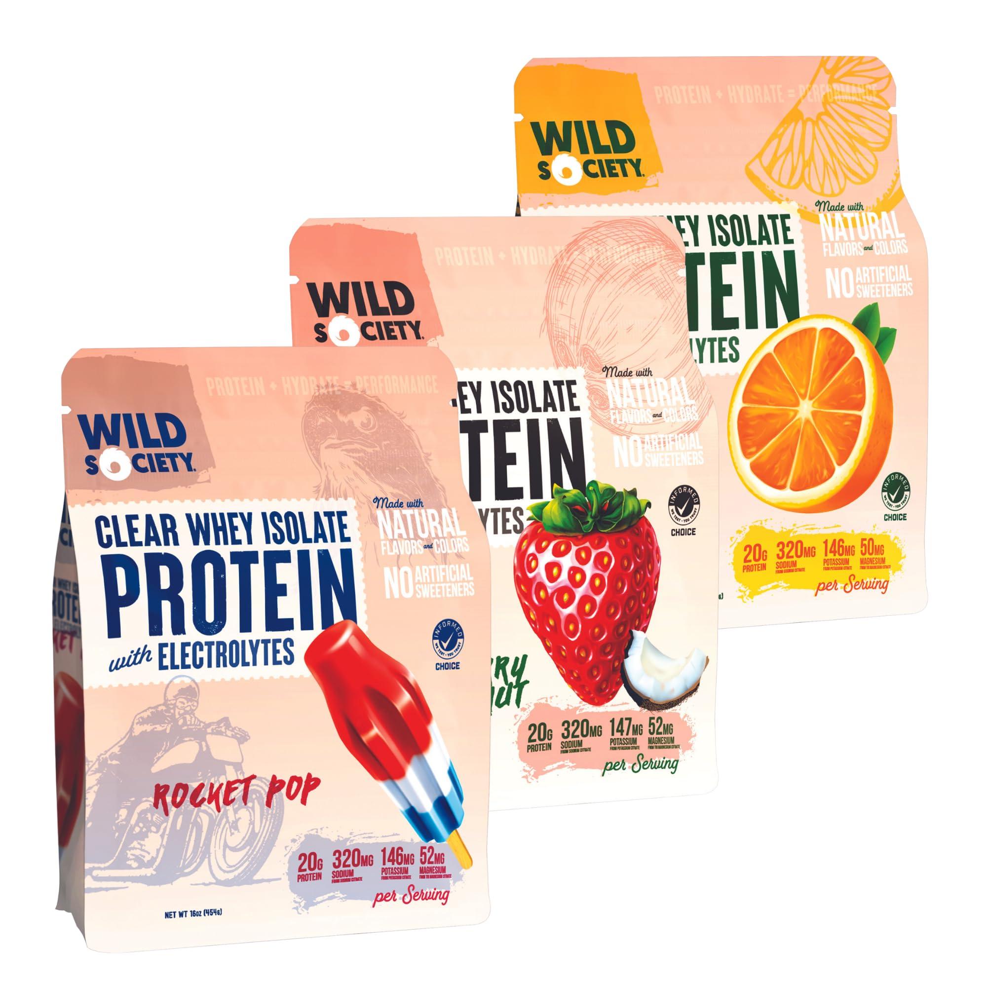 - Premium Clear Whey Protein w/ Electrolytes: Put on muscle and stay hydrated all in one! Wild Society Nutrition's clear protein drink offers 20 grams of high-quality protein per serving, combined with essential electrolytes making it the optimal post workout recovery powder. Perfect for athletes, fitness enthusiasts, and anyone seeking a refreshing, clean protein boost without added sugars or artificial ingredients.