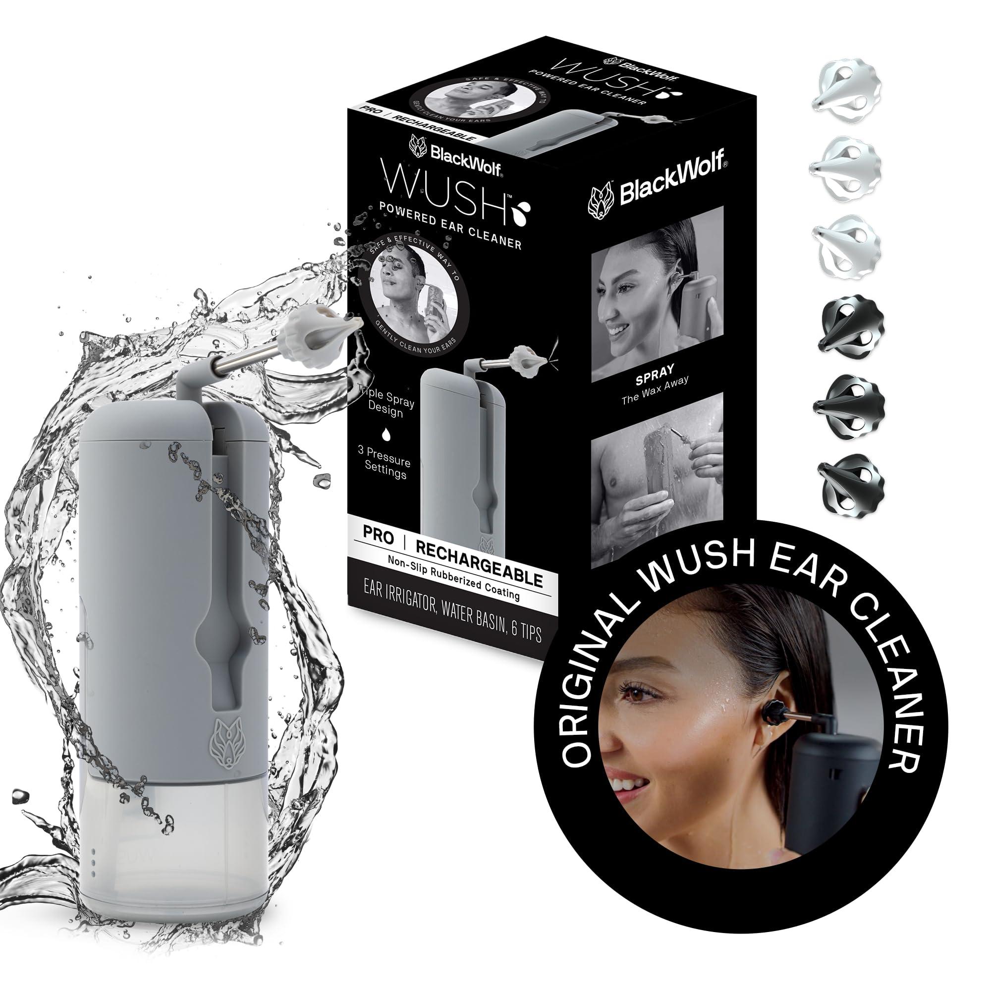 - Safe & Effective Ear Wax Removal: Wush Ear Cleaner Pro by Black Wolf is a safe, effective, and gentle way to clean your ears. Our pro version features a rubberized shell. It's now in a new, compact size but with the same great cleaning power! Includes a Grey Wush Pro water powered ear cleaner, USB charging cord, water basin, and 6 silicone replacement tips. Wush helps gently loosen and prevent wax buildup. Color: Grey
