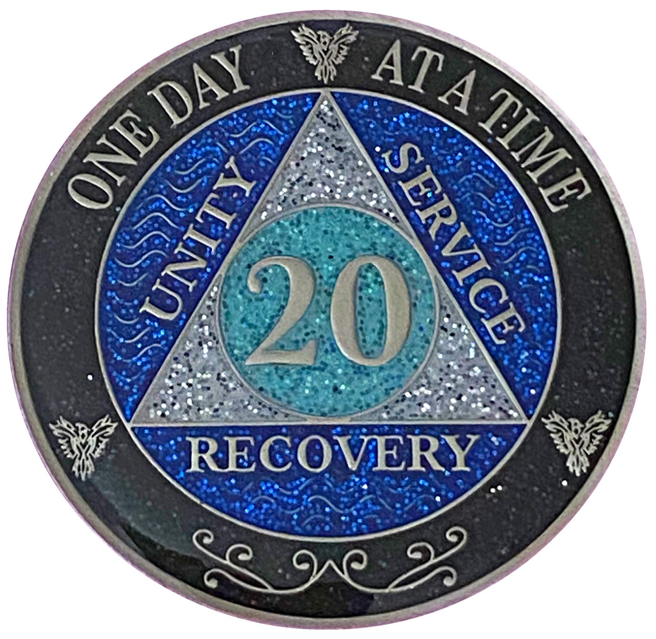 AA Recovery Silver Color Plated Glitter Medallion, Black Rainbow, Blue, Silver Glitter Coin, Epoxy Covered