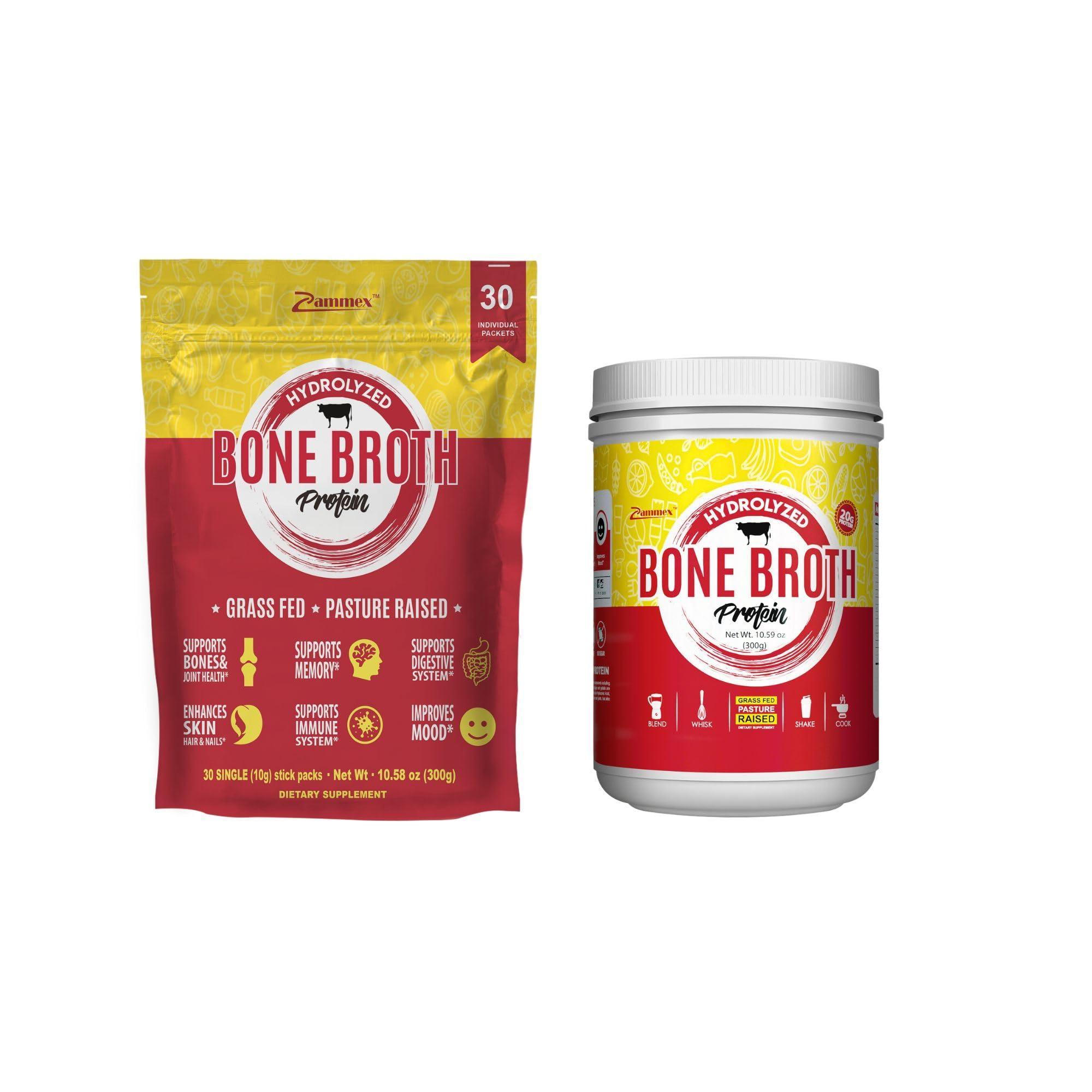 - PREMIUM BONE BROTH PROTEIN POWDER: ZAMMEX Bone Broth is made from simmering bovine bones in water which is high in nutrients as many protein components including collagen and gelatin are leached from the bones and connective tissues during the cooking process. The collagen and gelatin are hydrolyzed into amino acids, which greatly increases its bio-availability.
